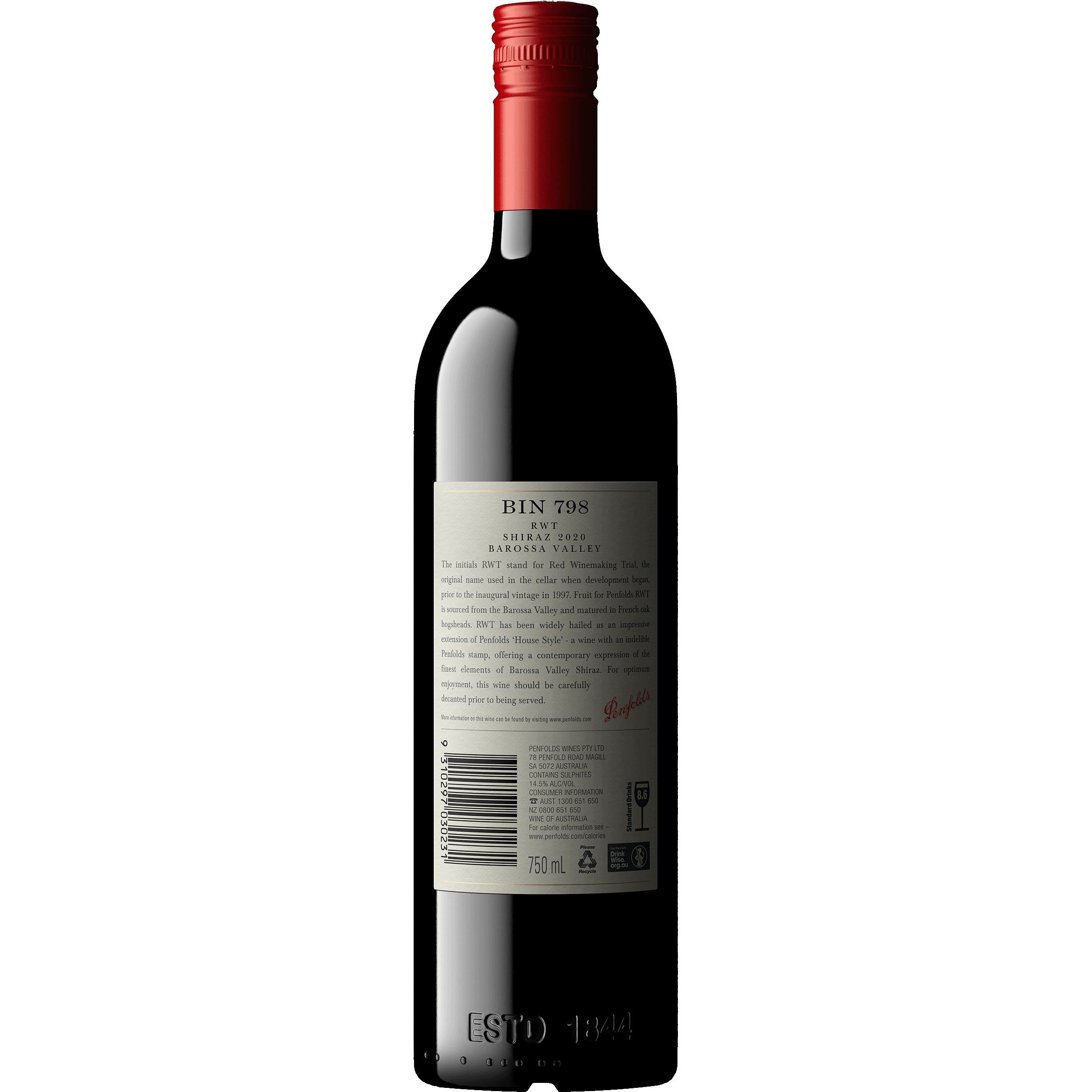 The initials RWT stand for ‘Red Winemaking Trial’, the name given to the project internally when developmental work began in 1995. Naturally, now no longer a ‘Trial’ RWT Shiraz was launched in May 2000 with the 1997 vintage. Since the 2014 vintage it has been allocated Bin number 798, based on the alpha-numeric telephone punch dial, to reflect its established status within the Penfolds portfolio. These wines have the precision, concentration, persistency and balance to age for many years. The best vintages should last at least thirty years.